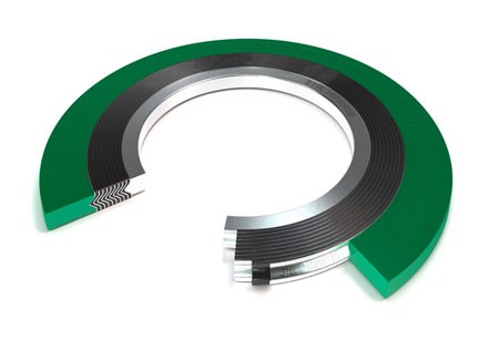 The spiral wound gasket is semi-metallic, comprising of a spirally wound v-shaped stainless steel strip and a non-metallic filler material, such as graphite or PTFE. Also on the gasket, is a solid outer ring used for centering and controlling compression. This minimizes the risk of material creep through over-tightening.